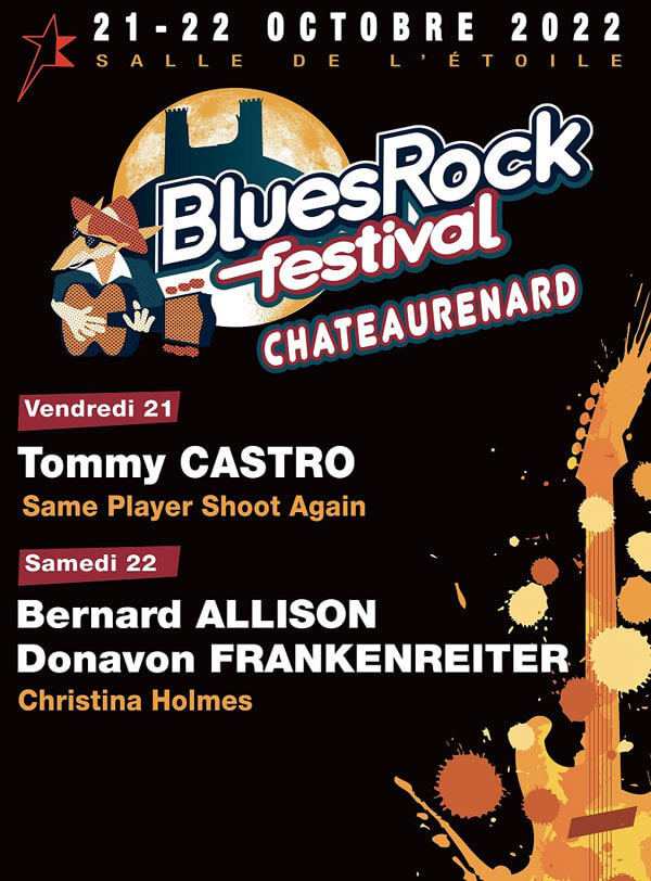 Le Blues Rock Festival revient à la salle de l’Etoile à Châteaurenard  pour une édition 2022 pleine de promesses. Ce festival qui a déjà 20 ans d’existence, se veut être un grand moment de partage autour de la musique blues et ses musiques associées. Les 21 et 22 octobre 2022, 5 concerts de haut vol seront au programme avec un mélange de blues, soul, folk, rock et même funk et une pluie de talents dont certains de renommée mondiale comme Tommy Castro qui donnera pour l’occasion sont unique concert de l’année en France.