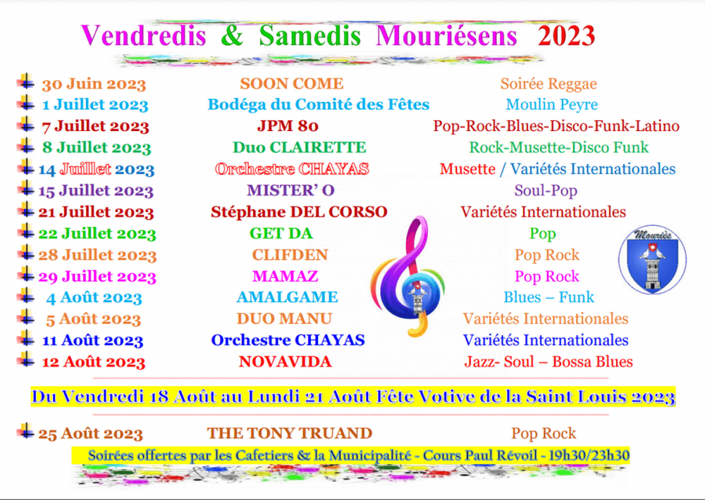 Rendez-vous pour les vendredis et samedis mouriésiens, de 19h30 à minuit, sur le cours Paul Révoil à Mouriès pour profiter de ces soirées musicales, offertes par les cafetiers et la municipalité !