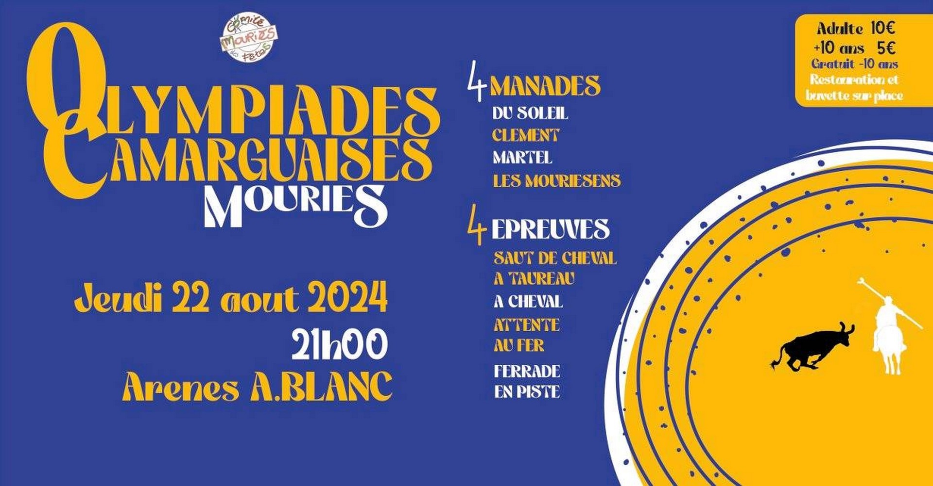 Du 21 au 25 août 2025, Mouriès s’embrase pour la fête votive du village. Elle débutera avec les Olympiades Camarguaises, aux Arènes de Mouriès, jeudi 21 août à partir de 21h ! Une soirée spectaculaire durant laquelle les gardians des 4 manades invitées montreront leur maîtrise du cheval comme du taureau à travers 4 épreuves traditionnelles des jeux gardians comme le saut de cheval à taureau et la ferrade en piste.