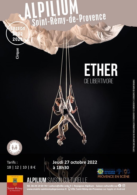 Spectacle de cirque aérien par excellence, Ether, le dernier spectacle de la Cie Libertivore, nous invite à découvrir des êtres fantastiques, mi-dieux, mi-humains mi-animaux. Comme deux planètes entre ciel et terre…dans un paysage lunaire, les deux entités se font face, l’une semblant être le miroir de l’autre.