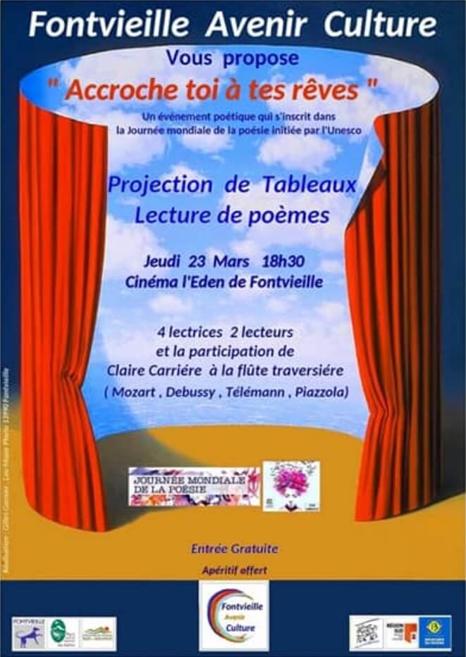 A l’occasion de la Journée Mondiale de la Poésie 2023, l’association Fontvieille Culture Avenir propose une soirée de poésie le jeudi 23 mars à l’Eden Cinéma. 4 lectrices et deux lecteurs déclameront une srie de poèmes sur le thème » Accroche toi à tes rêves ». Ils seront accompagnés de la projection de tableaux par les notes suaves de Claire Carrière à la flûte traversière ( Mozart, Debussy, Telemann, Piazzola ).
