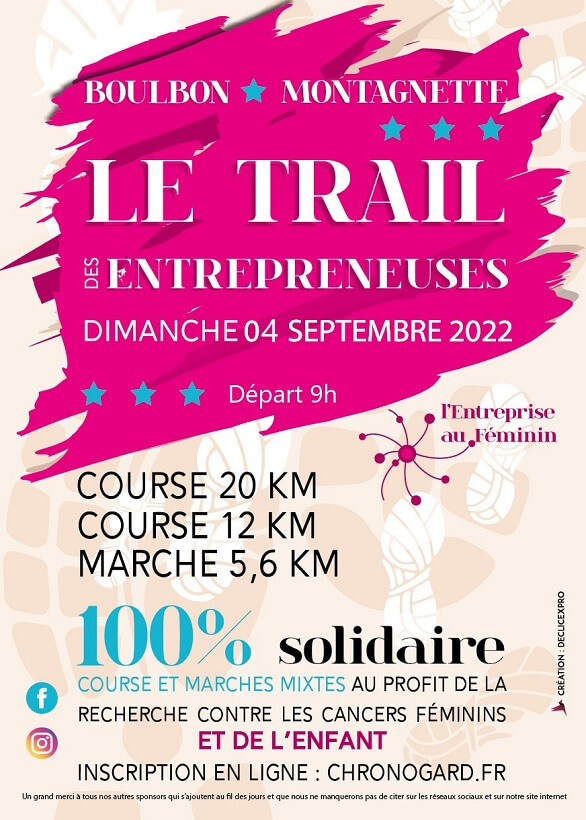 L’association de femmes chefs d’entreprises L’Entreprise au Féminin organise la 3ème édition du Trail des Entrepreneuses le dimanche 2 avril 2023. Départ à 9 heures de Boulbon pour de la marche sur 5,6 km et de la course à pied sur 12 ou 20 km. Les bénéfices de l’opération sont reversés à un centre de soin contre les cancers infantiles et féminins comme l’hôpital Sainte Catherine à Avignon ou la Timone à Marseille. L’an dernier, 25 000 euros avaient pu ainsi être versés à ces 2 établissements de la région.