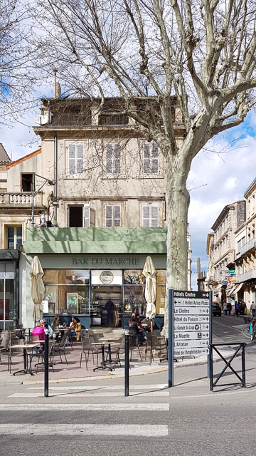 Le Bar du Marché c’est en effet une adresse bien connue des Arlésiens et cela depuis bien, bien, bien longtemps. Avec sa grande et agréable terrasse, les habitués savent profiter de ce lieu été comme hiver, notamment le samedi matin après avoir fait un tour au marché. On s’y retrouve en famille ou entre amis pour partager un café ou un petit apéro au soleil et profiter de l’ambiance si particulière qu’il règne ce jour-là sur le boulevard des Lices. Modernisé en 2017, le bar du marché porte avec lui une longue histoire, rendez-vous historique des marchands ambulants et des arlésiens depuis des décennies, c’est un » bout d’Arles » à lui tout seul et l’une des plus belles terrasses pour profiter la ville.