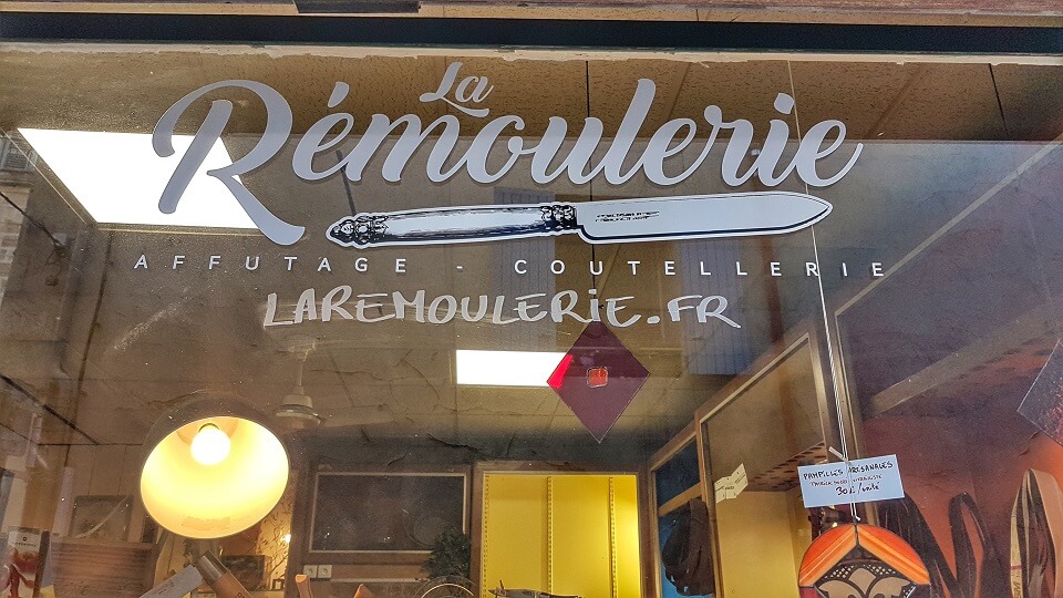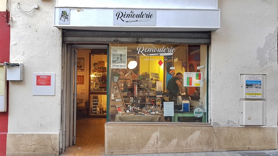Vos couteaux ne coupent plus grand chose et vous ne connaissez pas encore Thierry de La Remoulerie à Arles ? Prenez vite vos vieux couteaux et votre courage à deux mains et franchissez la porte de sa petite boutique-atelier de la rue tardieu à Arles. Vous ne pourrez pas le rater il sera derrière son comptoir en train d’affûter, aiguiser et bichonner les lames qu’on lui aura confié. Rassurez-vous, derrière son look…de rémouleur et ses épaules de déménageur, il est plutôt super sympa Thierry et surtout passionné par son métier d’artisan. Il vous recevra toujours avec plaisir pour un devis d’affûtage, un conseil, une réparation, un achat de couteau ou tout simplement pour parler coutellerie, artisanat mais aussi solidarité locale, musique et plein d’autres choses intéressantes !