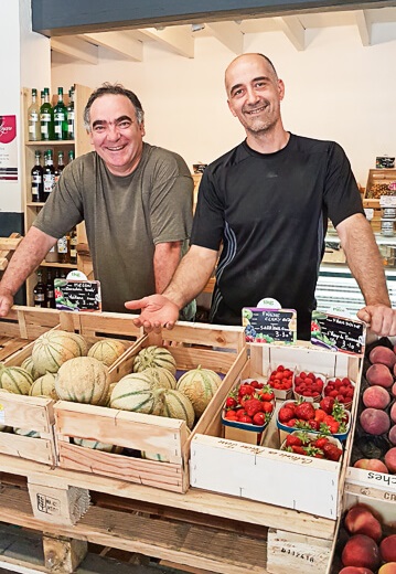 Pour tous les produits de saison, Fred et Cyril s’approvisionnent directement auprès de producteurs installés dans un rayon de 20km. Tomates, pêches, salades, ici, c’est du circuit très court qui est proposé, dans un souci de qualité et de traçabilité mais aussi de prix.