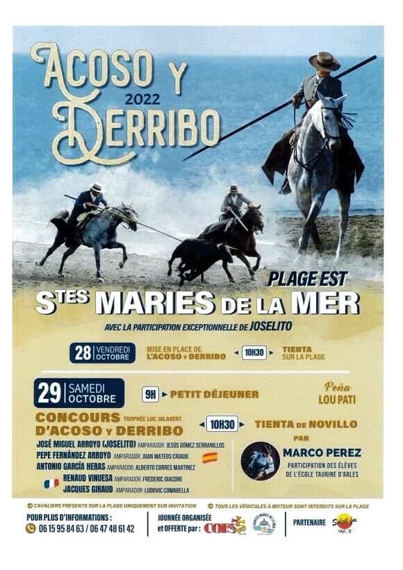 L’Acoso y Derribo aura lieu cette année les 25 et 26 octobre 2024 sur la plage Est des Saintes Maries de la Mer et sera suivi de la tienta des novilllos.