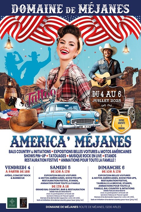 Le Domaine de Méjanes organise organise du 4 au 6 juillet 2025 son premier AMERICA MEJANES. Un nouveau festival sur 3 jours dédié à l’Amérique, ses vieilles voitures, ses pinups, sa gastronomie, sa musique et tout ce que le rêve américain peut éveiller en chacun de nous ! Au programme du week-end, de grands bals Country, un rassemblement de vieilles voitures américaines et de Harley Davidson vrombissantes, des pinups, des tatoueurs, un taureau mécanique et un taureau à la broche, des hamburgers, des stands spécialisés culture US, bref tout l’univers des sixties concentré au Domaine de Méjanes pour 3 jours joyeux et so american !