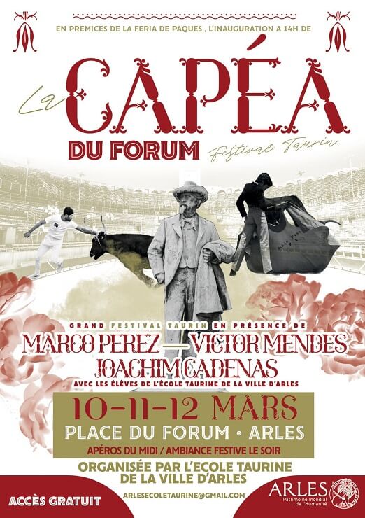 La traditionnelle Capea du Forum de l’Ecole Taurine d’Arles est organisée chaque année en mars en prémices de la Féria de Pâques ! Cette année, elle aura lieu les 7, 8 et 9 mars 2025 dans les arènes portatives installées sur la mythique place du Forum. 3 jours de tauromachie et de fête réunissant jeunes passionnés et figuras de la tauromachie, sans oublier nos cafetiers préférés qui oseront prendre la cape.