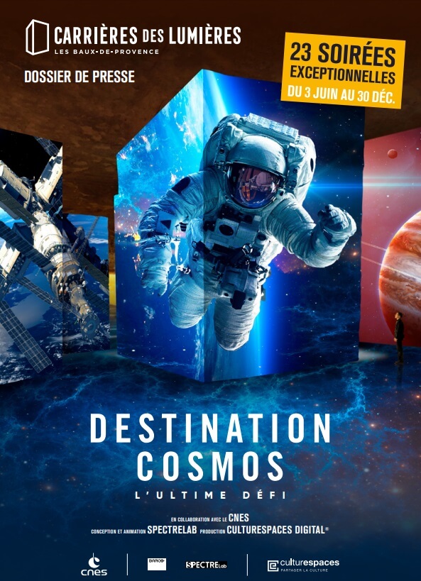 Suite au succès de « Destination Cosmos » à l’Atelier des Lumières à Paris en octobre 2021, Culturespaces, en collaboration avec le CNES programme à nouveau ce voyage dans l’espace aux Carrières des Lumières des Baux de Provence.