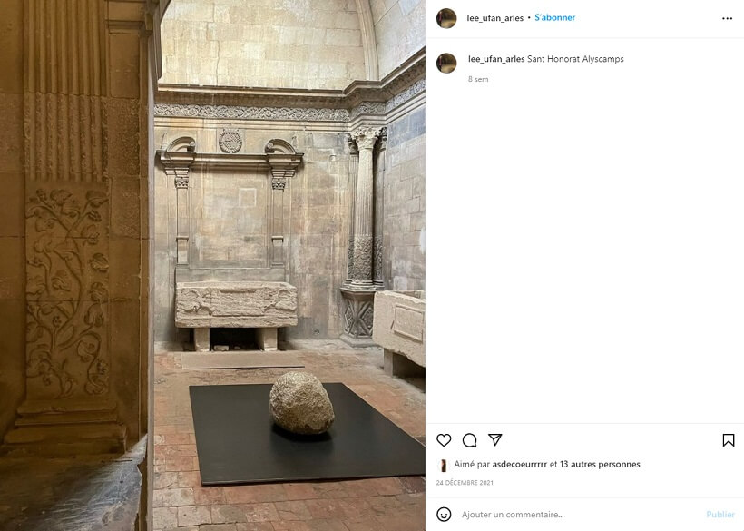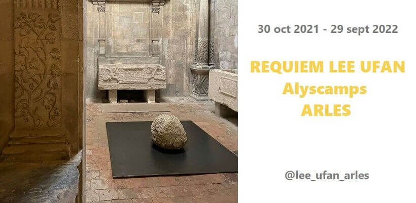 En installant sa fondation à Arles ( les travaux sont en cours rue Vernon ), Lee Ufan témoigne de son attachement à la ville d’Arles. En prémice aux futures expositions de sa fondation, le designer coréen s’est installé aux Alyscamps à Arles depuis fin octobre pour un requiem en 13 oeuvres spécialement créées pour le lieu. Au milieux des sarcophages et chapelle médiévale, ce requiem de scultures originales se découvre aux côtés des sarcophages antiques qui parsèment cette antique cité des morts.