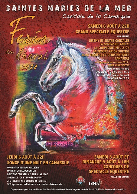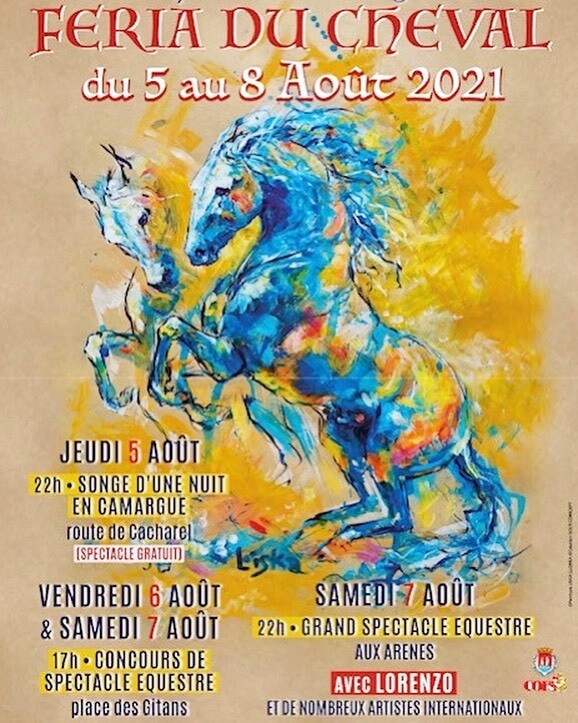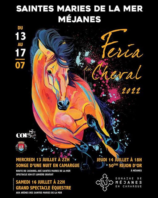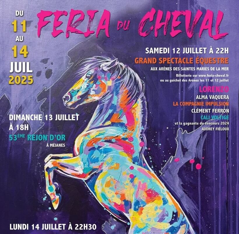 Dressage, voltige, les spectacles équestres se succèdent aux arènes avec les plus prestigieux artistes et cavaliers du moment. Les rues et les places du village sont également de la fête avec parades, concours équestres, démonstrations et nuits flamenca ! La fête se dupliquera également du côté des arènes de Méjanes le dimanche 13 juillet pour le célèbre Rejon d’Or qui mettra aux prises les stars du rejon comme Guillermo Hermoso de Mendoza et Lea Vicens face à 6 toros d Gallon Frères.