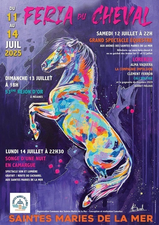 Lors de la Féria du Cheval, les Saintes Maries de la Mer deviennent le lieu de rencontre des arts équestres et le cheval y est célébré tel un dieu. La Féria du Cheval 2025 aura lieu cette année du 11 au 14 juillet. Cette fête existe depuis plus de 20 ans et rassemble tous les aficionados du cheval, du taureau et de la musique gitane, les 3 piliers incontournables de l’identité des Saintes et de la culture camarguaise. Ce sont eux qui inspirent toutes les représentations de cette Féria du Cheval.