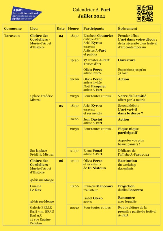 A-Part renoue avec ses débats animés et propose deux discussions autour de l’expression à double sens de L’art dans le décor, d’une part dans nos environnements au quotidien, d’autre part à l’heure du réchauffement climatique, de l’IA, des inégalités sociales et des conflits sur la planète.