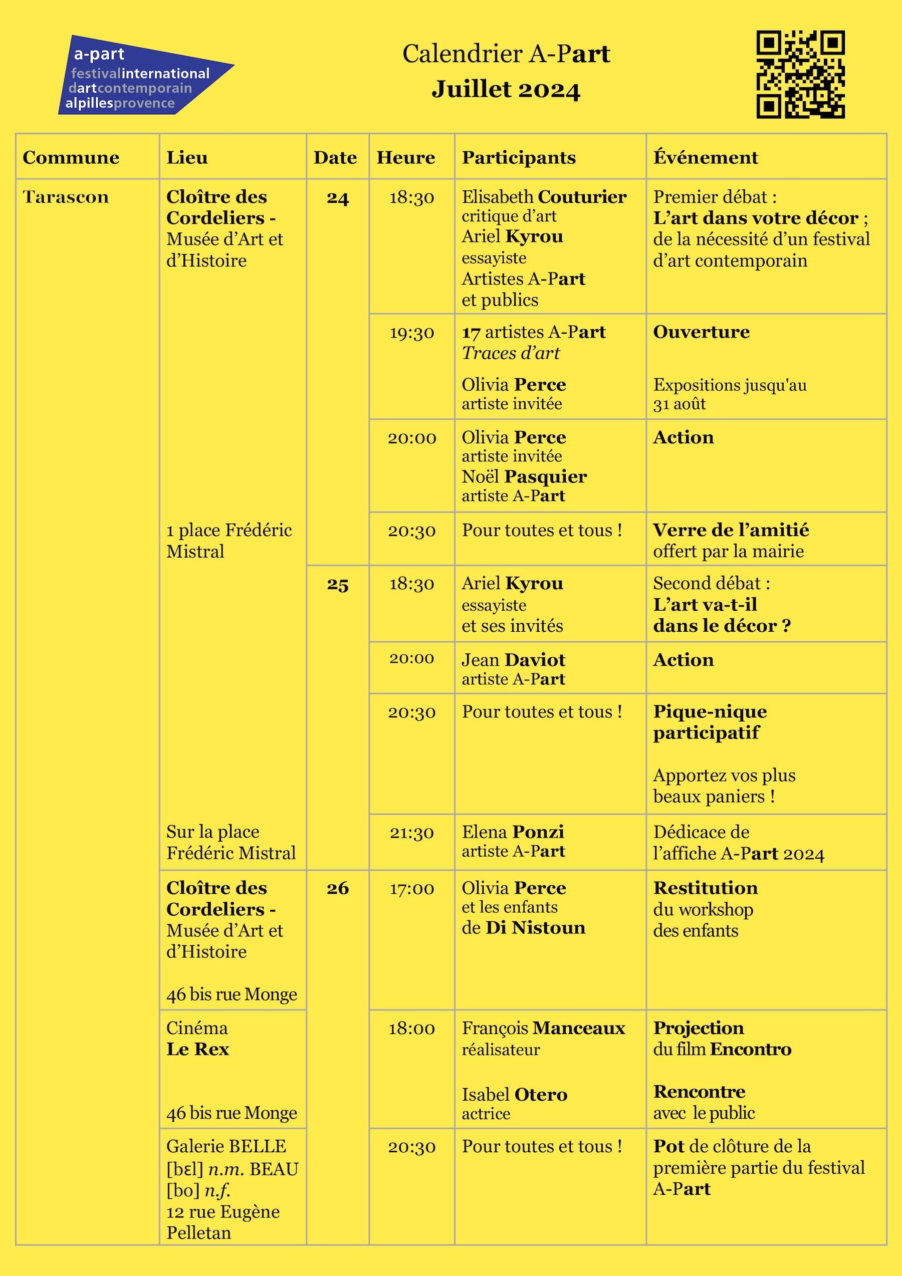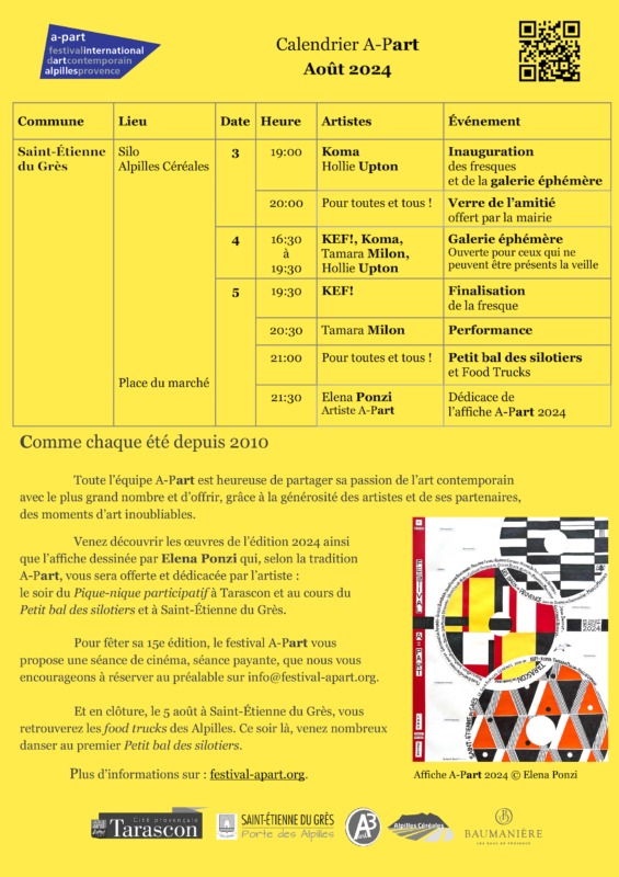Un atelier d’enfants sous la direction d’une jeune artiste, une rétrospective tarasconnaise, un pique-nique participatif, deux performances, une surprise d’artiste, le petit bal des silotiers, une reprise de fresque en direct, une fin d’après-midi au cinéma, deux signatures d’artistes.
