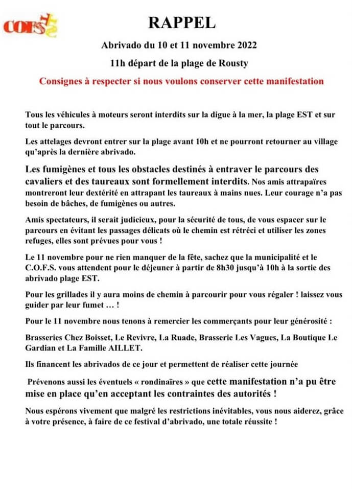 Prévenons aussi les éventuels « rondinaïres » que cette manifestation n’a pu être mise en place qu’en acceptant les contraintes des autorités ! Nous espérons que, malgré les restrictions de sécurité inévitables, vous nous aiderez, par votre présence et votre civisme, à faire de ce festival d’abrivado une totale réussite !