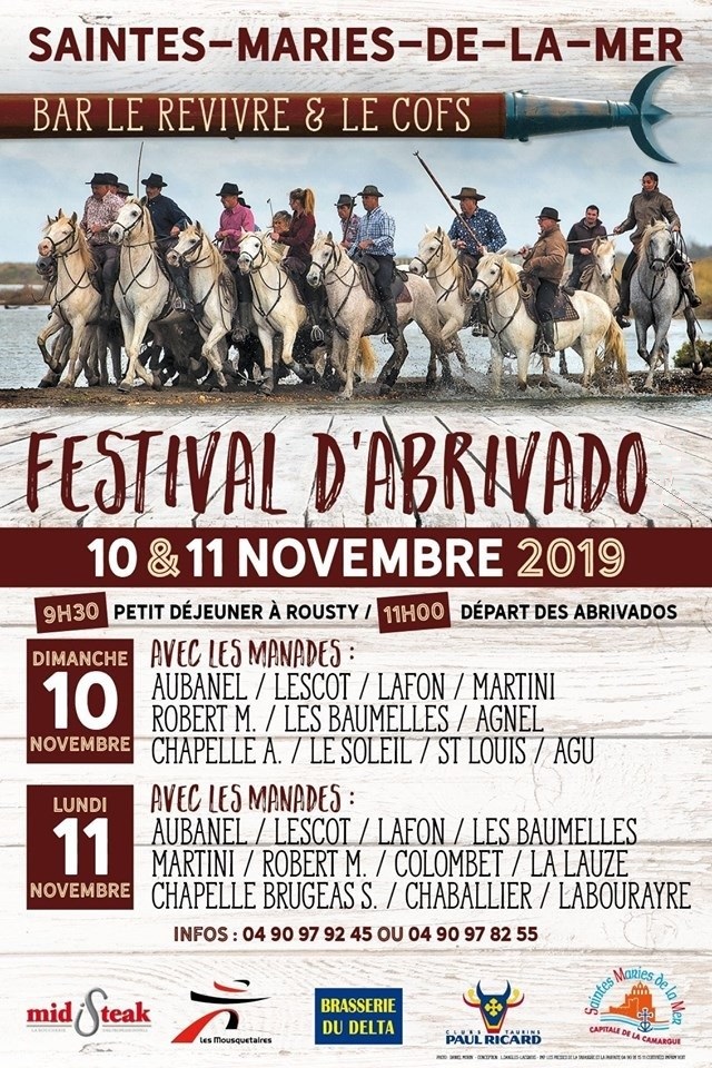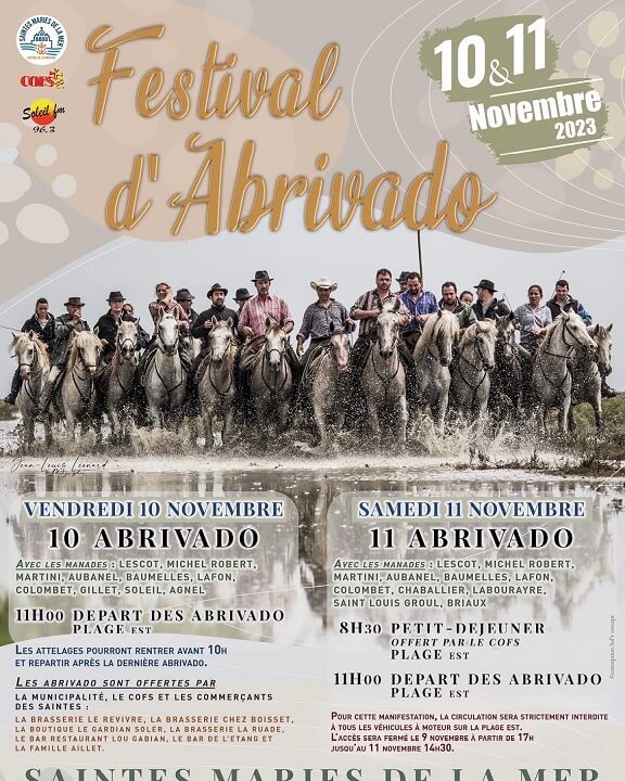 Chaque jour, le festival commence par le petit-déjeuner offert sur la plage Est au lieu dit « Rousty » (parking Bambou Palm Beach). Départ des cavaliers et des taureaux à partir de 11h avec une colonne de 11 abrivados qui vont se succéder tout au long du parcours de 6 km qui les amènera jusqu’aux arènes.