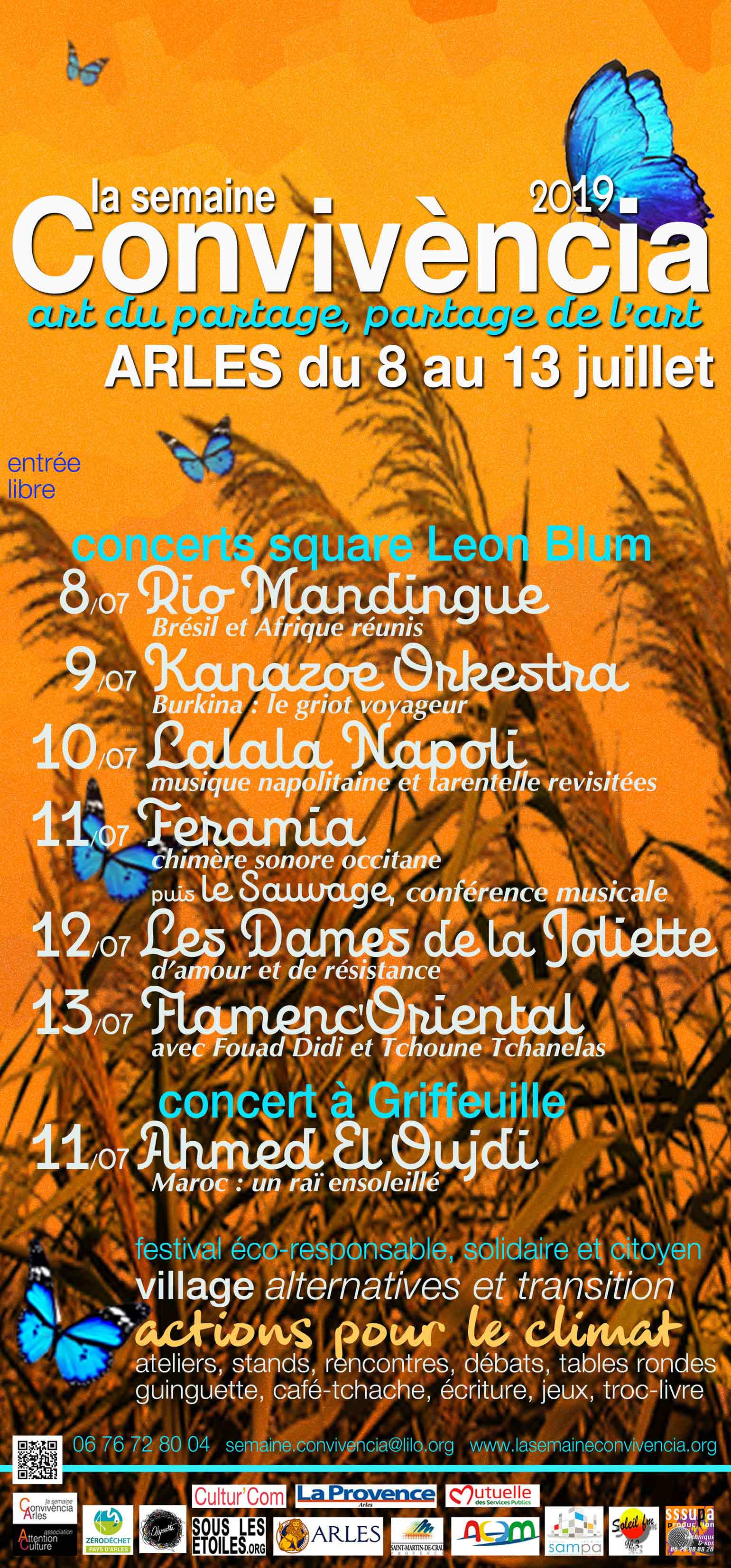 Convivència, c’est aussi un festival de musiques du monde qui ambitionne de faire partager nos artistes “coups de cœur“, des talents rares hors des sentiers battus à découvrir avec un grand concert quotidien : le répertoire arabo-andalou féminin de Meryem Koufi (8 juil.), la rencontre entre poésie occitane et poésie persane avec La Beluga (9 juil.), le raffinement du chââbi folk-pop du tunisien Jawhar (10 juil.), les chansons du sud de l’Italie du Duo Nannani (11 juil.) et les classiques balkaniques et rocambolesques de Fatum Fatras (12 juil.).