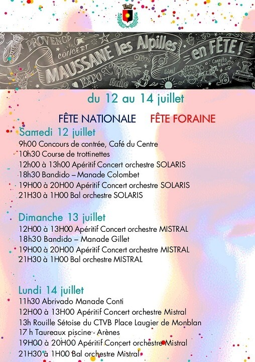 Du 12 au 14 juillet 2025, Maussane les Alpilles célèbre la fête nationale et le 14 juillet. Au programme, des taureaux, bal et ambiance festive pendant trois jours.