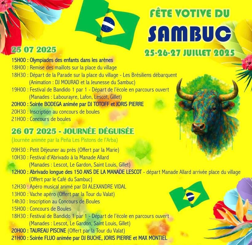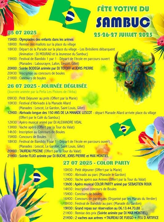La Fête Votive 2025 du Sambuc aura lieu du 25 au 27 juillet. Au programme, ambiance brésilienne partout dans le village, mais aussi des taureaux, une soirée fluo, une color party, des concours de boules et de partègues, un toro fuego et un feux d’artifice final, le tout dans l’ambiance exceptionnelle du Sambuc !