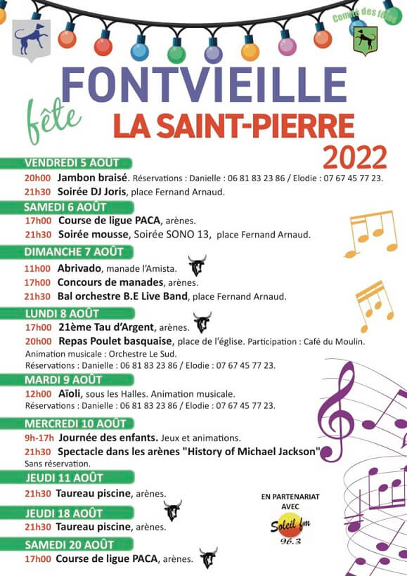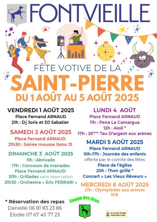 La Fête de la Saint Pierre à Fontvieille aura lieu cette année du 1er au 6 août 2025. Au programme de ces 6 jours de festivité : taureaux, aïoli géant, bal et soirée mousse dans une ambiance festive où toutes les générations se rassemblent autour des traditions locales.