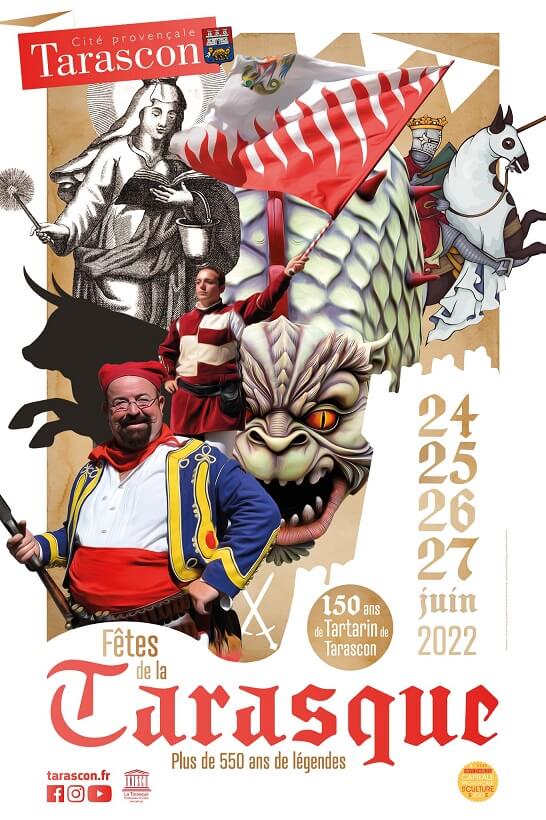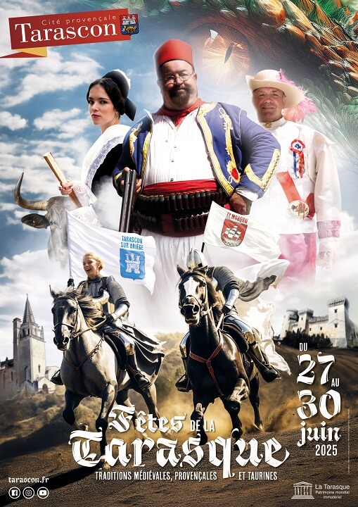 Cette année, les fêtes de la Tarasque de Tarascon auront lieu du 26 au 30 juin 2025. Au programme : la Tarasque vrombissant dans les rues de la ville, l’arrivée de Tartarin par le Rhône, les défilés et repas en costume médiévaux mais aussi courses camarguaises aux arènes, foire foraine et concerts au village Bodega !