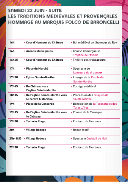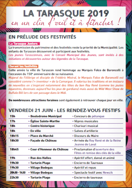 - 18h45: PLACE DU MARCHÉ – HÔTEL DE VILLE – Allocution de Lucien Limousin, Maire de Tarascon, avec le Conseil Municipal des Jeunes. Bénédiction de la Tarasque et des Tarascaïres Par le Père Michel Savalli. Cortège en direction du Château. Avec le Réveil Tarasconnais.