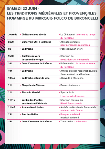 - 19h15 : COUR D’HONNEUR DU CHÂTEAU – Accueil des Ambassadeurs d’Ariège, d’Allemagne, d’Italie, d’Auvergne et de Provence. / Proclamation d’ouverture des Fêtes / Remise des clés de la ville par le bon Roy René au Maire et à la jeunesse. / Cortège royal vers la rue des Halles.