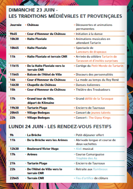 - 9h00 – La Brèche : Petit-déjeuner des Fêtes de la Tarasque animé par la Peña Provençale. Offert par la municipalité, ouvert à tous.