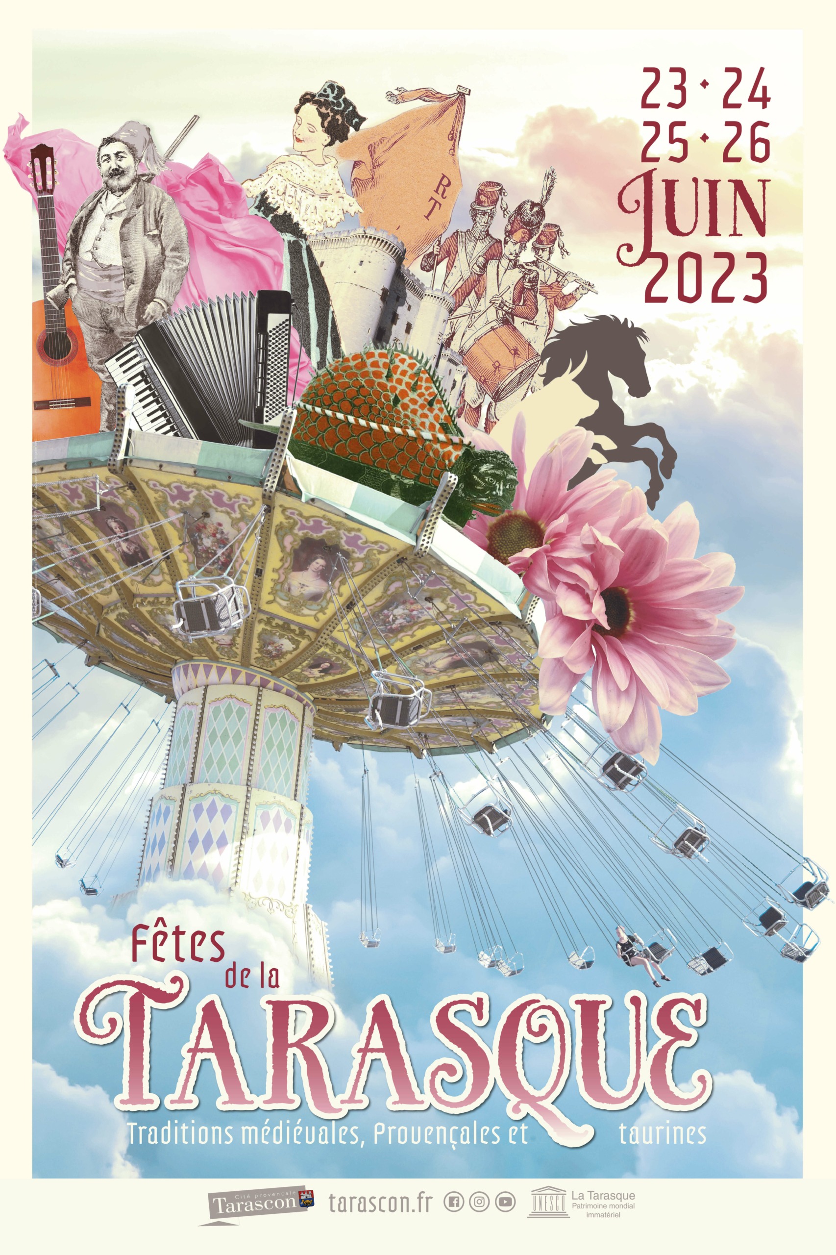 - 22h30 : PLACE DU CHÂTEAU – Grand spectacle de clôture des Fêtes de la Tarasque 2025. La ville de Tarascon vous invite à un spectacle entre magie et performances visuelles sensationnelles ! Petits et grands seront impressionnés par la prestation des artistes de la Compagnie Transe Express – Inventeurs d’imaginaires. Imaginez un mobile fait de tambours majors. Imaginez une trapéziste évoluant au beau milieu de cette grappe aérienne et semant un vent de folie de son gracieux ballant… Tout au bout d’une file de petits soldats de plomb, il y a le benêt qui conte fleurette aux spectateurs… Tout là-haut dans les airs on découvrira que sous sa casaque de pitre se cachait une belle trapéziste… Trois poupées géantes glissent à travers la foule et enchantent le public avec leur répertoire tandis qu’une clique de tambours s’agite dans leurs jupons. > Spectacle gratuit ouvert à tous
