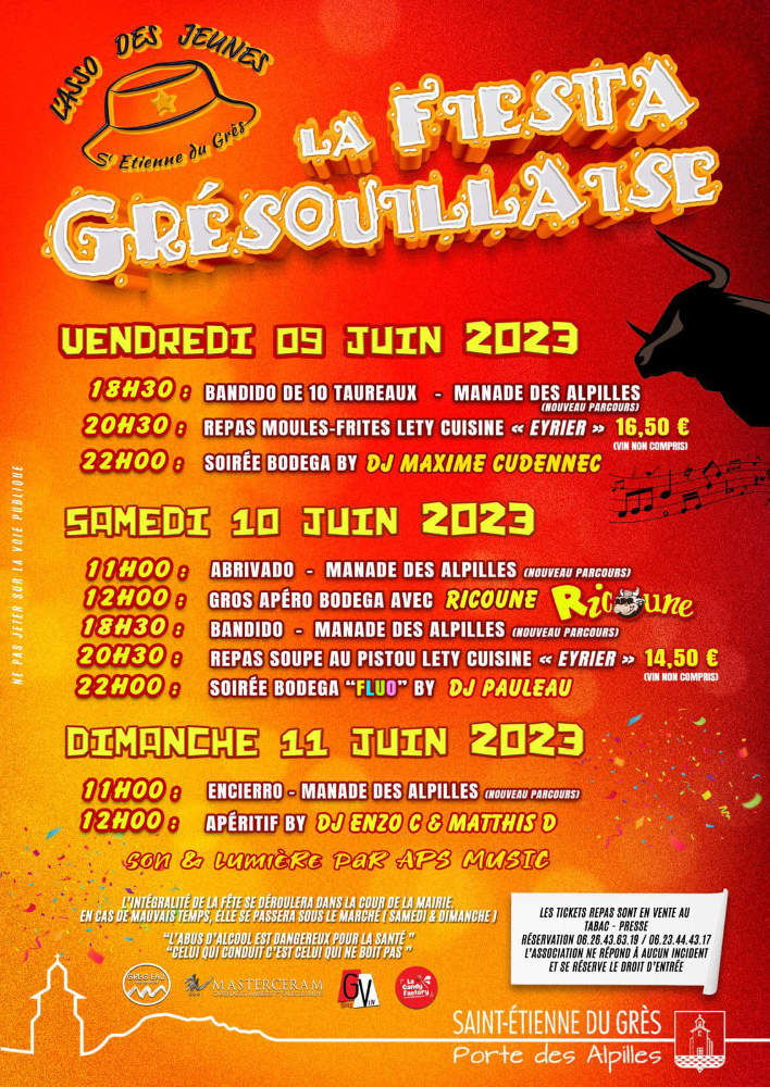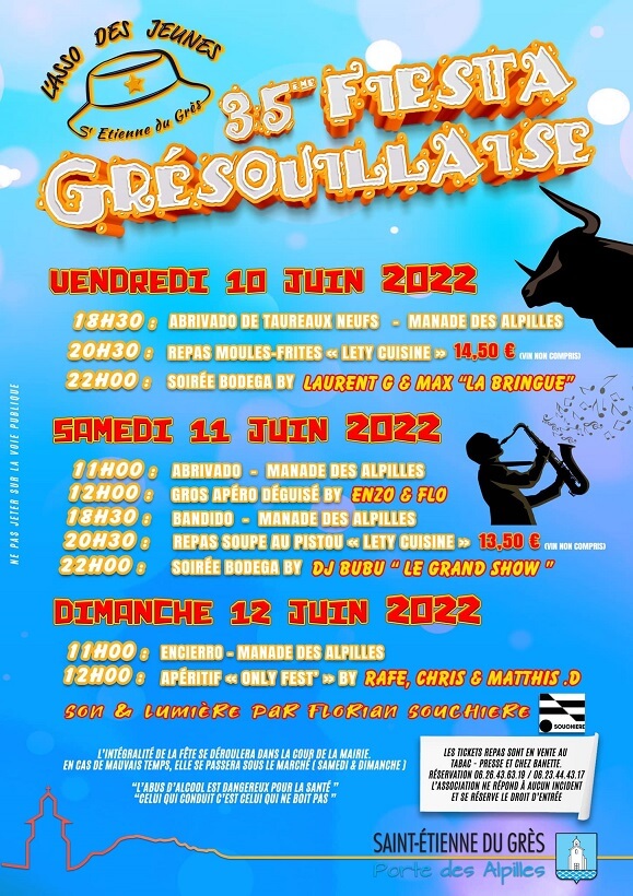 38ème édition de la Fiesta Grésouillaise du vendredi 6 au dimanche 8 juin 2025 à Saint Etienne du Grès. Organisée par l’Asso des Jeunes de St Etienne du Grès, cette fête est réputée pour sa bonne humeur et son énergie débordante. Tout au long du week-end se succèdent abrivados, repas populaires et soirées bodega endiablées.