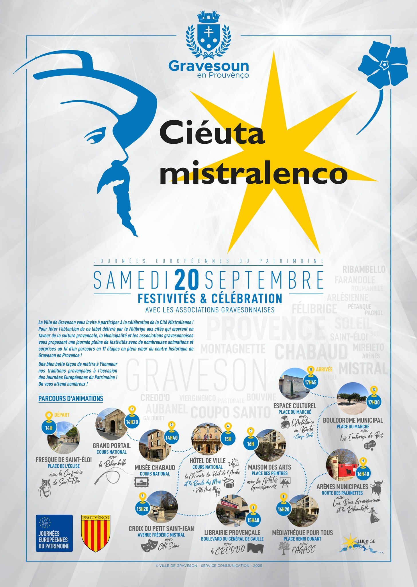 Pour fêter l’obtention de ce label délivré par le Félibrige aux cités qui œuvrent en faveur de la culture provençale, la Municipalité et les associations gravesonnaises vous proposent le samedi 20 septembre 2025 une après-midi pleine de festivités avec de nombreuses animations et surprises au fil d’un parcours en 11 étapes en plein cœur du centre historique de Graveson en Provence !