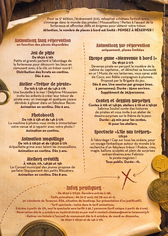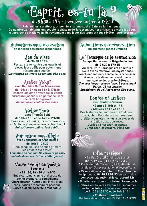 - Réservations à compter du 1er octobre par téléphone au 04.90.91.01.93 ou par mail à contact-chateau@mairie-tarascon13.fr