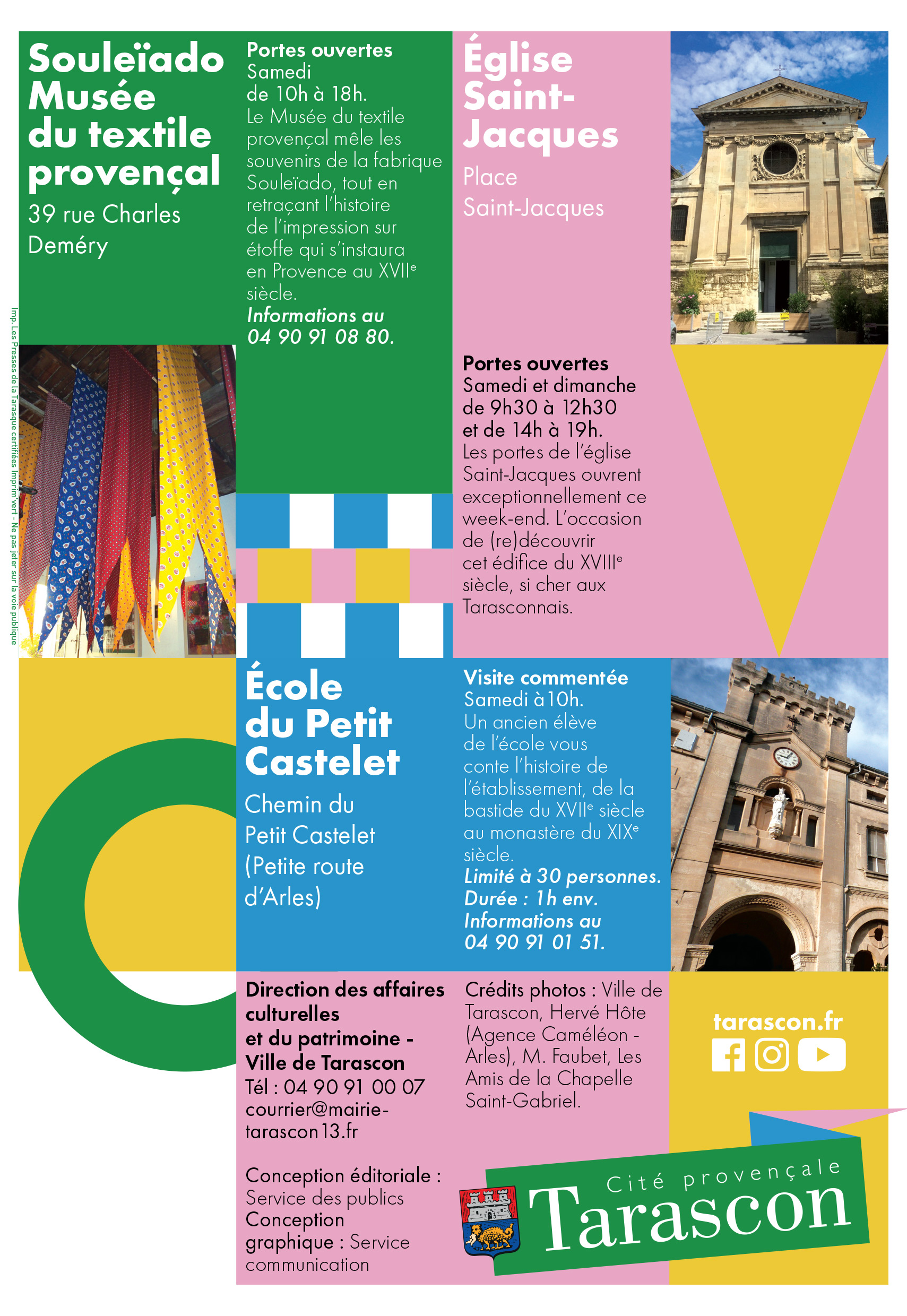D’autres animations sont prévues, en centre-ville , à la Chapelle Saint-Gabriel (portes ouvertes et visites commentées), à l’Abbaye Saint-Michel de Frigolet (visites guidées), à la Collégiale Ste Marthe (portes ouvertes, exposition, animation musicale), à l‘Eglise Saint-Jacques (portes ouvertes), au Musée du textile provençal Souleïado (portes ouvertes), l’École du Petit Castelet (visites commentées), à la Chapelle et Prieuré de Lansac (visite guidée).