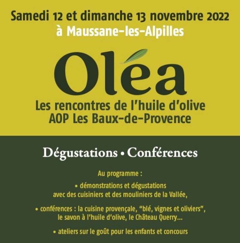 Les 12 et 13 novembre 2022, la salle Agora à Maussane accueille « OLEA, Rencontre de l’huile d’olive 2022 » qui réunira tous les acteurs du secteur de l’huile d’olive en Pays d’Arles (producteurs, mouliniers, chefs cuisinier). Au programme, des conférences et plein d’animations autour de l’or vert des Alpilles et notamment l’Huile d’olive AOP Vallée des Baux. Les chefs de plusieurs restaurants réputés de maussane seront présents pour des ateliers culinaires et des recettes en direct pour