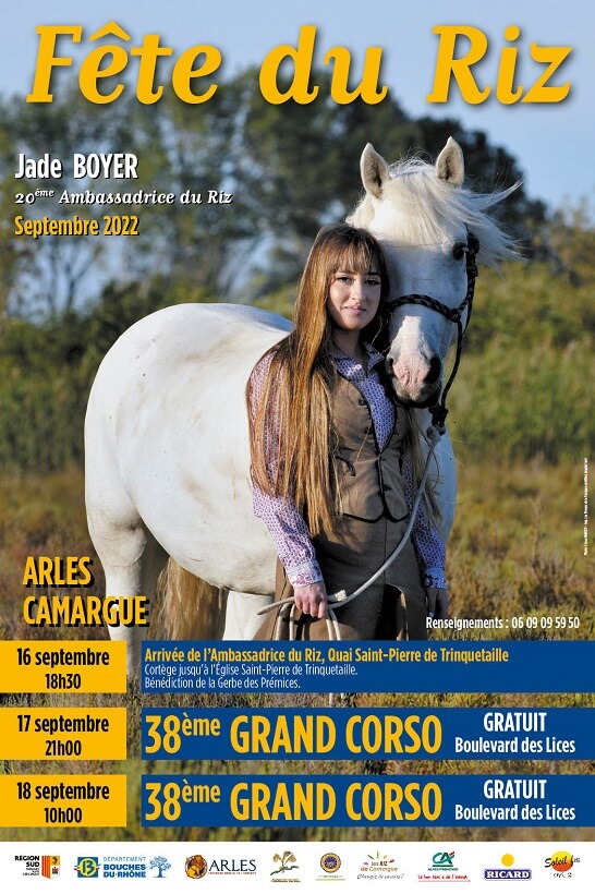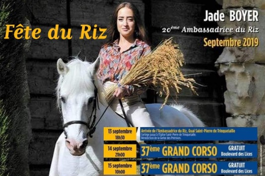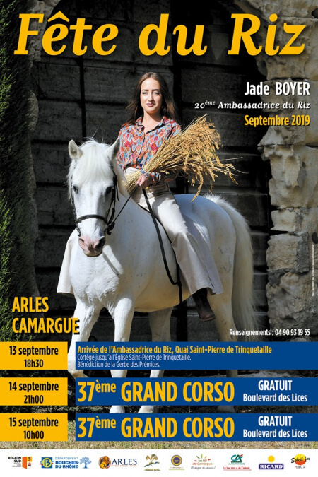 Elle sera ensuite en tête du Corso du Riz qui se déroulera samedi 20 septembre à 21h et dimanche 21 septembre à 10h sur le boulevard des Lices à Arles. Le 41ème Grand Corso du Riz réunie associations des quartiers et villages arlésiens qui auront confectionné des chars s’inspirant de la culture du riz et des traditions camarguaises.