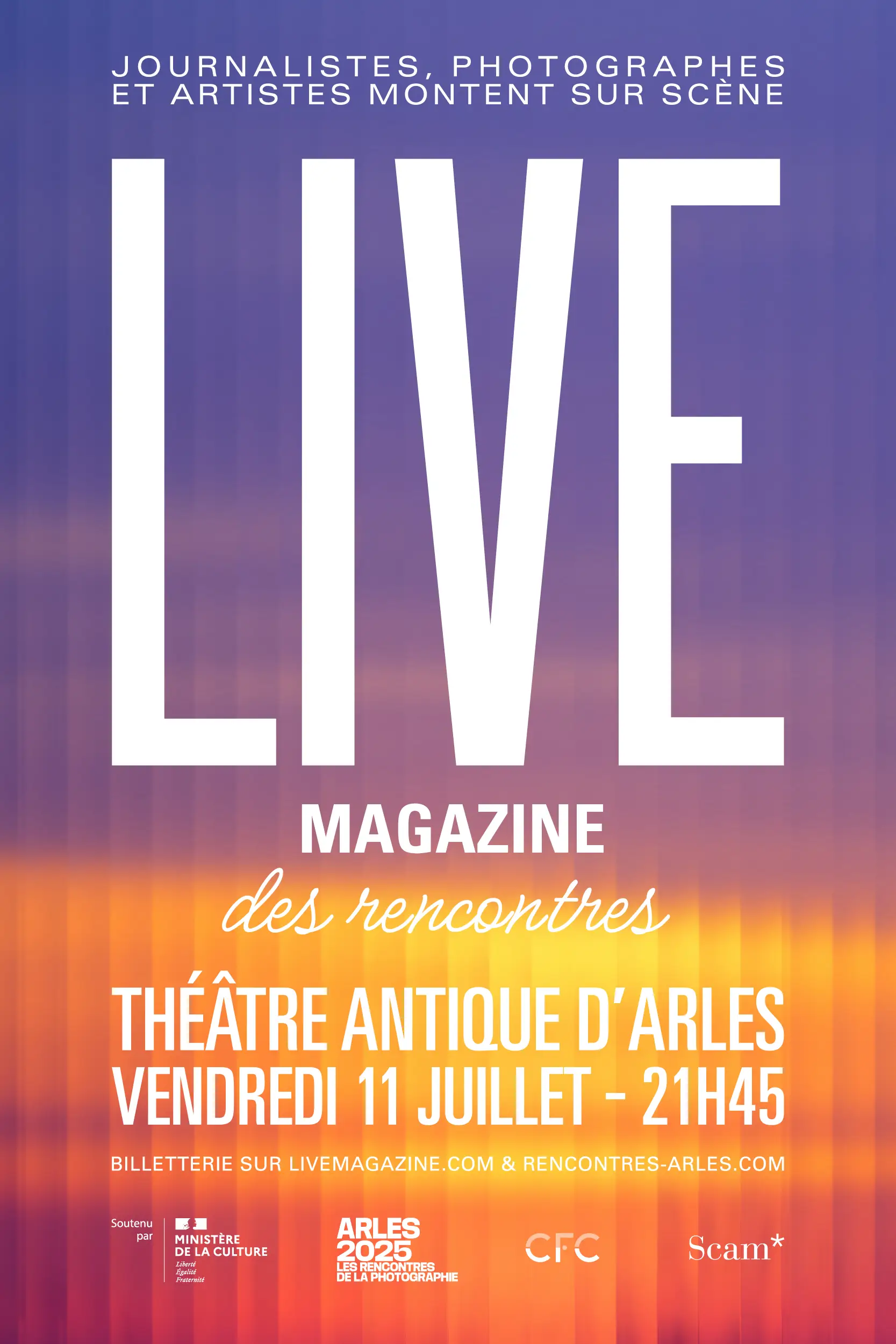 Le Live Magazine des Rencontres est né dans la nuit arlésienne, il y a huit ans. L’idée était de tenter une expérience éphémère « 99 % vraie » : une bande de photographes, d’artistes et de journalistes qui racontent, malgré leur trac, ce qu’ils ne pouvaient pas raconter ailleurs, créant ainsi, le temps d’un soir, un journal vivant. Cet été encore, sous les étoiles, dans le Théâtre antique, il y aura des « pages » qui se tournent, des « rubriques » qui se succèdent, on passera d’un sujet à un autre, d’un récit intime à une enquête planétaire, pour célébrer le pouvoir des images. Une nuit vibrante d’émotions. Un rendez-vous incontournable des Rencontres. Le tout en musique : à chaque récit, son rythme, son tempo, sa mélodie, sa fantaisie, son supplément d’âme.