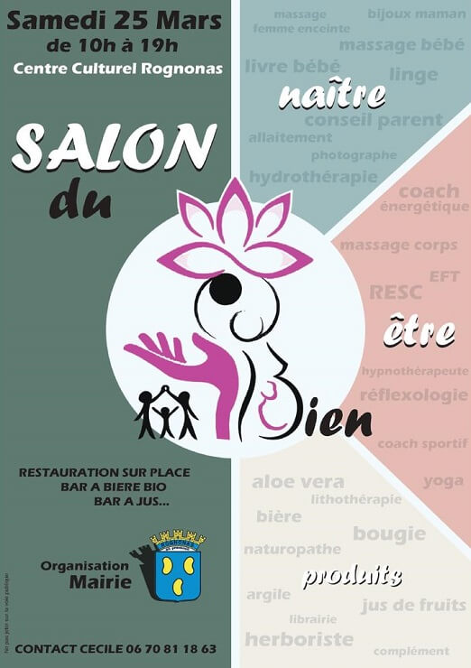 Les 22 et 23 mars 2025, Rognonas organise la 3ème édition de son Salon du Bien-être au centre culturel du village. Organisée par l’association Mille et cent ciels, l’idée est de proposer un week-end pour se faire du bien en toute zénitude grâce aux 30 professionnels présents et un seul mot d’ordre : bien naître / être ! Ateliers, conférences, démonstrations dans différents domaines comme le yoga, la diététique, la sophrologie, les geste de 1er secours, pour les grands comme les petits, voire les tout petits petits, pour vivre mieux et longtemps au naturel !