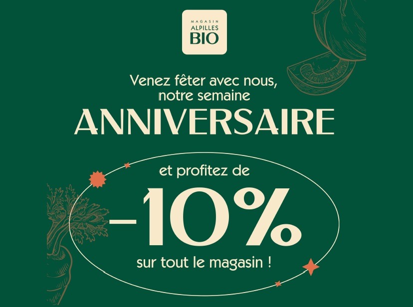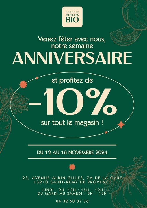 Comme chaque année, notre partenaire Alpilles Bio à St Rémy fête son anniversaire avec une semaine riche en animations et une remise exceptionnelle de 10% sur tout le magasin. C’est donc le moment de faire le plein de provisions en produits bio et naturels.