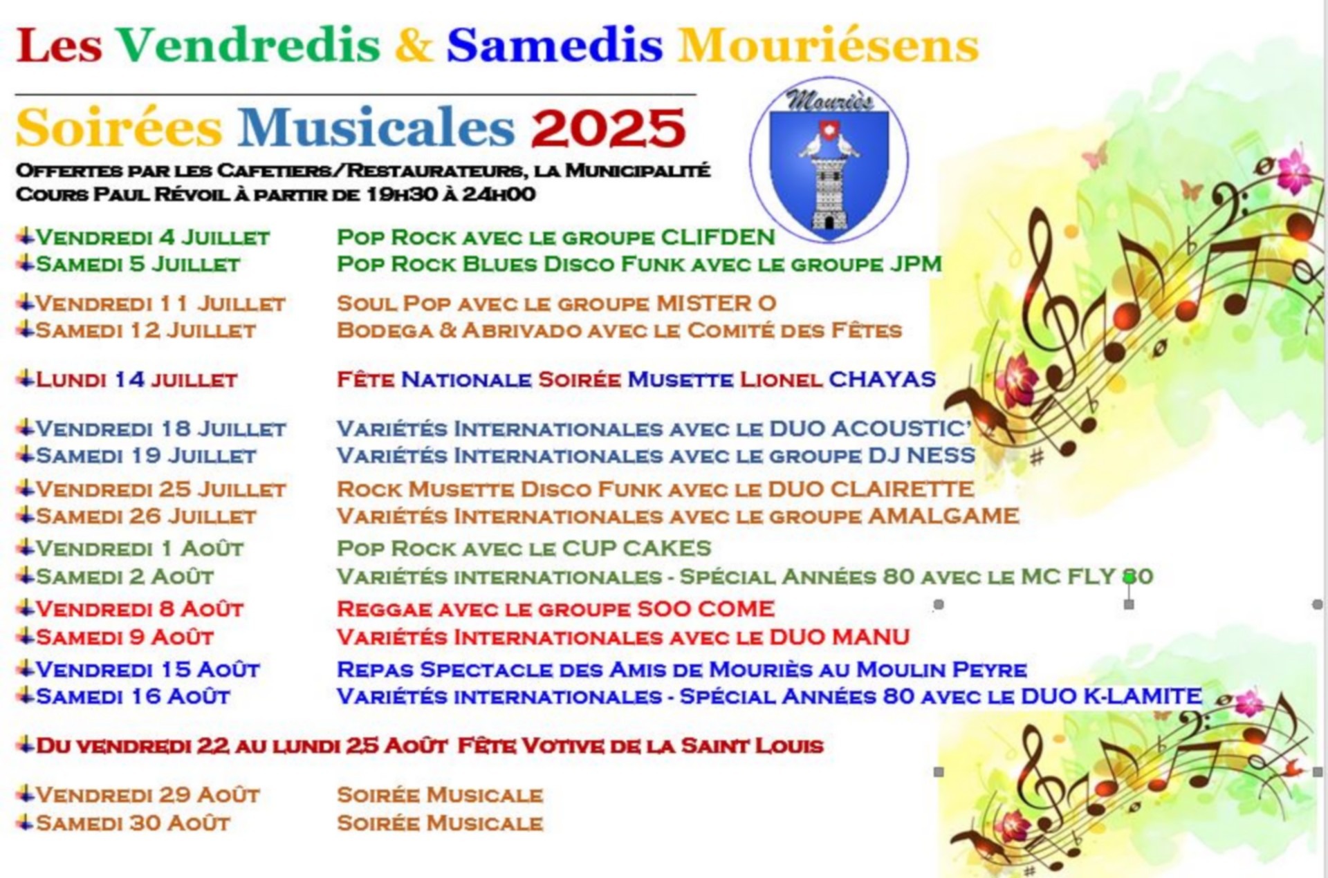 Rendez-vous pour les vendredis et samedis mouriésiens, de 19h30 à minuit, sur le cours Paul Révoil à Mouriès pour profiter de ces soirées musicales, offertes par les cafetiers et la municipalité !