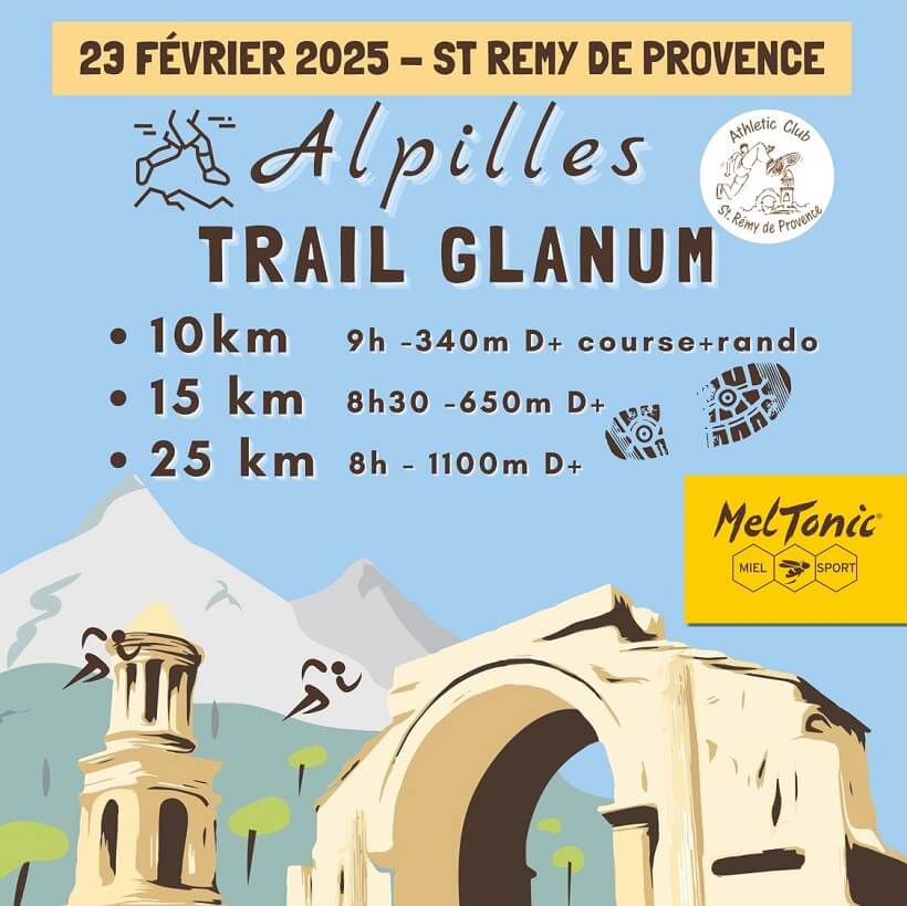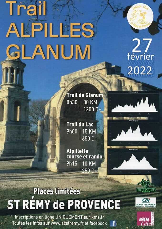 Le 23 février 2025, l’Athlétic Club Saint Rémy de Provence vous invite à participer au Trail Alpilles Glanum. Véritable parcours de trail au cœur du massif des Alpilles, les participants profiteront de superbes vues sur le Ventoux, le Luberon, la Montagnette et la Crau. 3 courses au programme : le Trail de Glanum de 25km, le Trail du Lac de 15km, et l’Alpillette (anciennement Traversée des Alpilles), soit en course soit en randonnée, sur 10 km et accessible à tous ! La championne du monde de Trail long 2023 Marion Delespierre sera la marraine de cette 9ème édition du trail Alpilles Glanum et participera à l’une des épreuves ainsi qu’à une séance de dédicace le 22 février à la salle Jean Macé !
